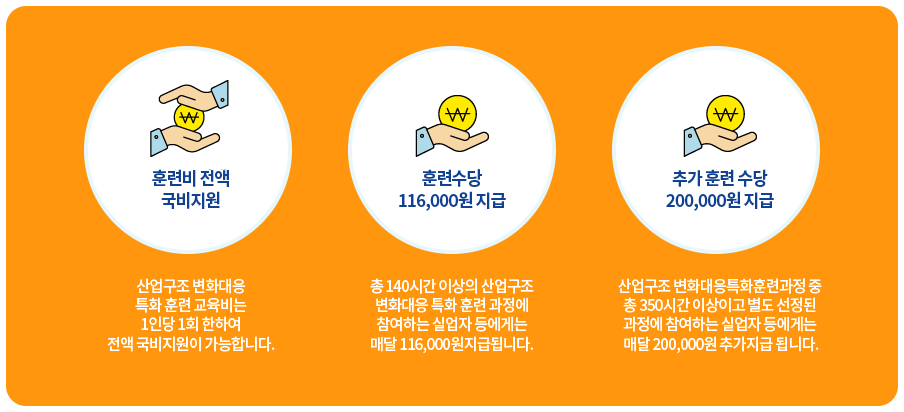 - 산업구조 변화 등에 따라 재직자, 실업자 등의 고용유지 및 이·전직 등을 활성화 하기 위하여 현장 수요에 기반한 훈련과정을 수시 공급하고, 훈련비 및 훈련장려금 등을 지원